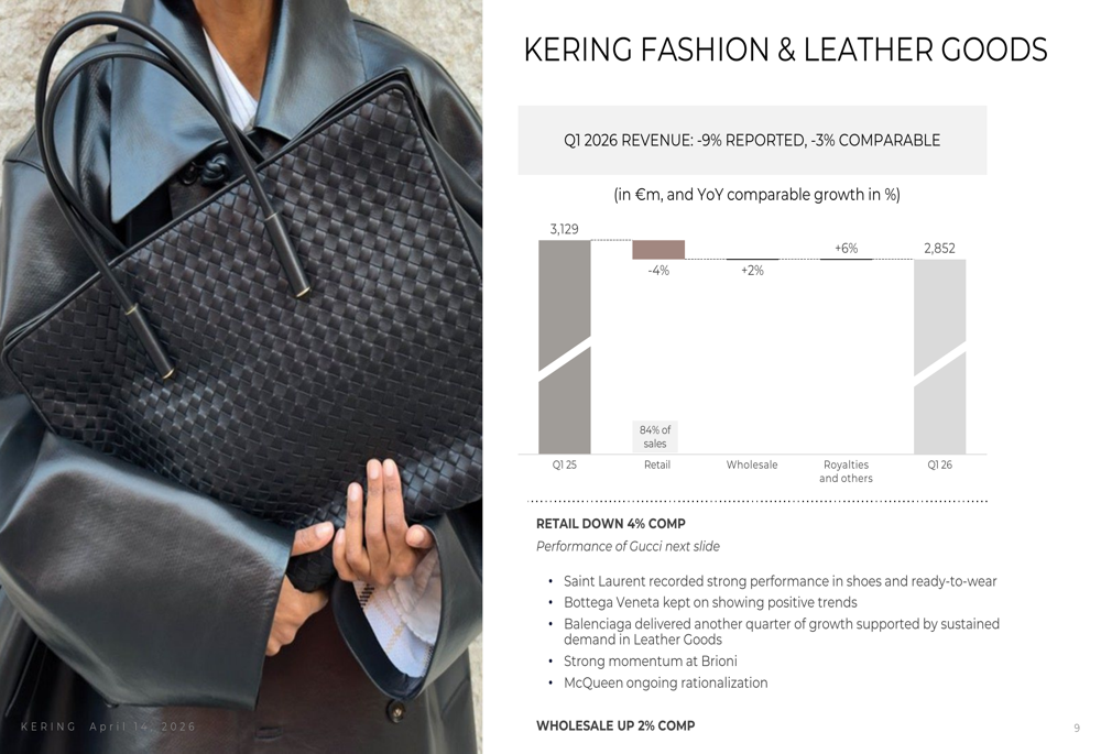 For the Fashion & Leather Goods segment specifically, the company highlighted strong performances from Saint Laurent and Bottega Veneta, continued growth from Balenciaga, building momentum at Brioni, and ongoing rationalization at McQueen.