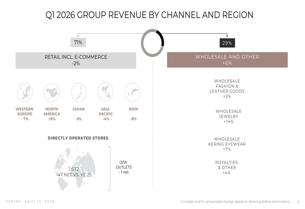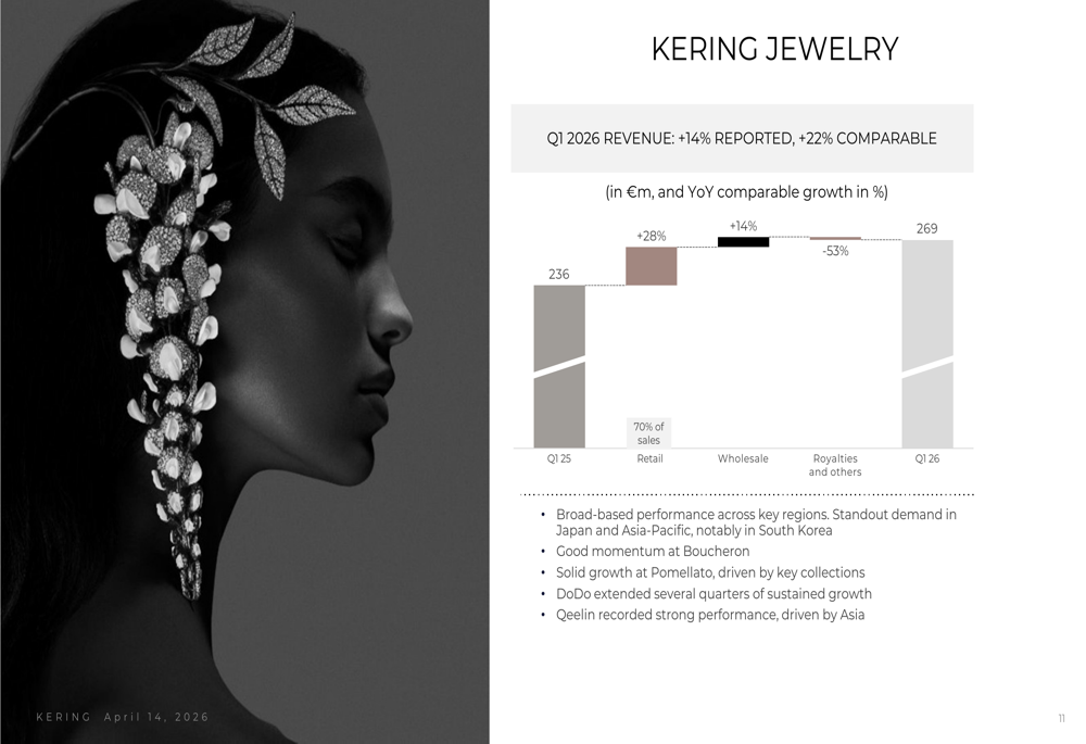 In stark contrast, Kering Jewelry delivered standout results with revenue of €269 million, up 14% on a reported basis and an impressive 22% on a comparable basis. The segment benefited from broad-based performance across key regions, with particularly strong demand in Japan and Asia-Pacific. Boucheron maintained good momentum, Pomellato posted solid growth, DoDo sustained its growth trajectory, and Qeelin delivered strong performance driven by Asian markets.