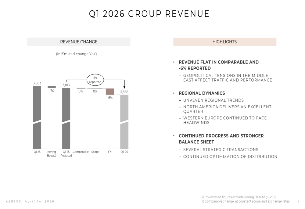 As shown in the following waterfall chart illustrating the revenue bridge from Q1 2025 to Q1 2026, currency headwinds and the disposal of Kering Beauté drove the reported decline while underlying business remained stable.