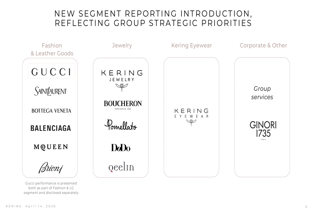 The presentation introduced Kering’s new segment reporting structure, which reorganizes the company’s brand portfolio to better reflect strategic priorities and operational focus.