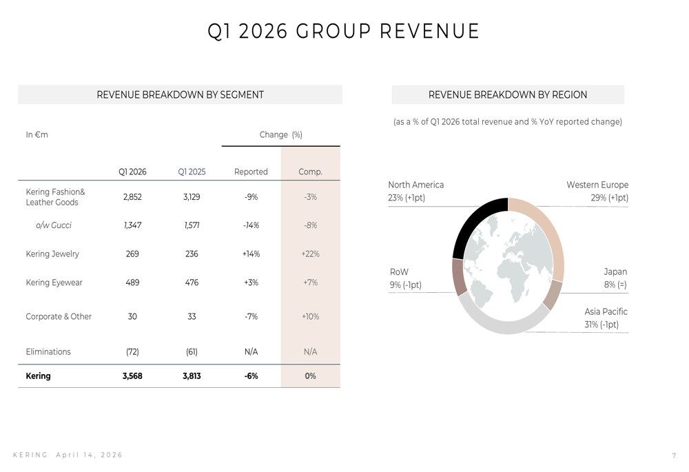 Kering reported group revenue of €3,568 million for the first quarter of 2026, representing a 6% decline on a reported basis but remaining flat year-over-year on a comparable basis. The stabilization comes after several quarters of declines and was driven by exceptional performances in the Jewelry and Eyewear segments, which offset continued weakness in the Fashion & Leather Goods division, particularly at flagship brand Gucci.